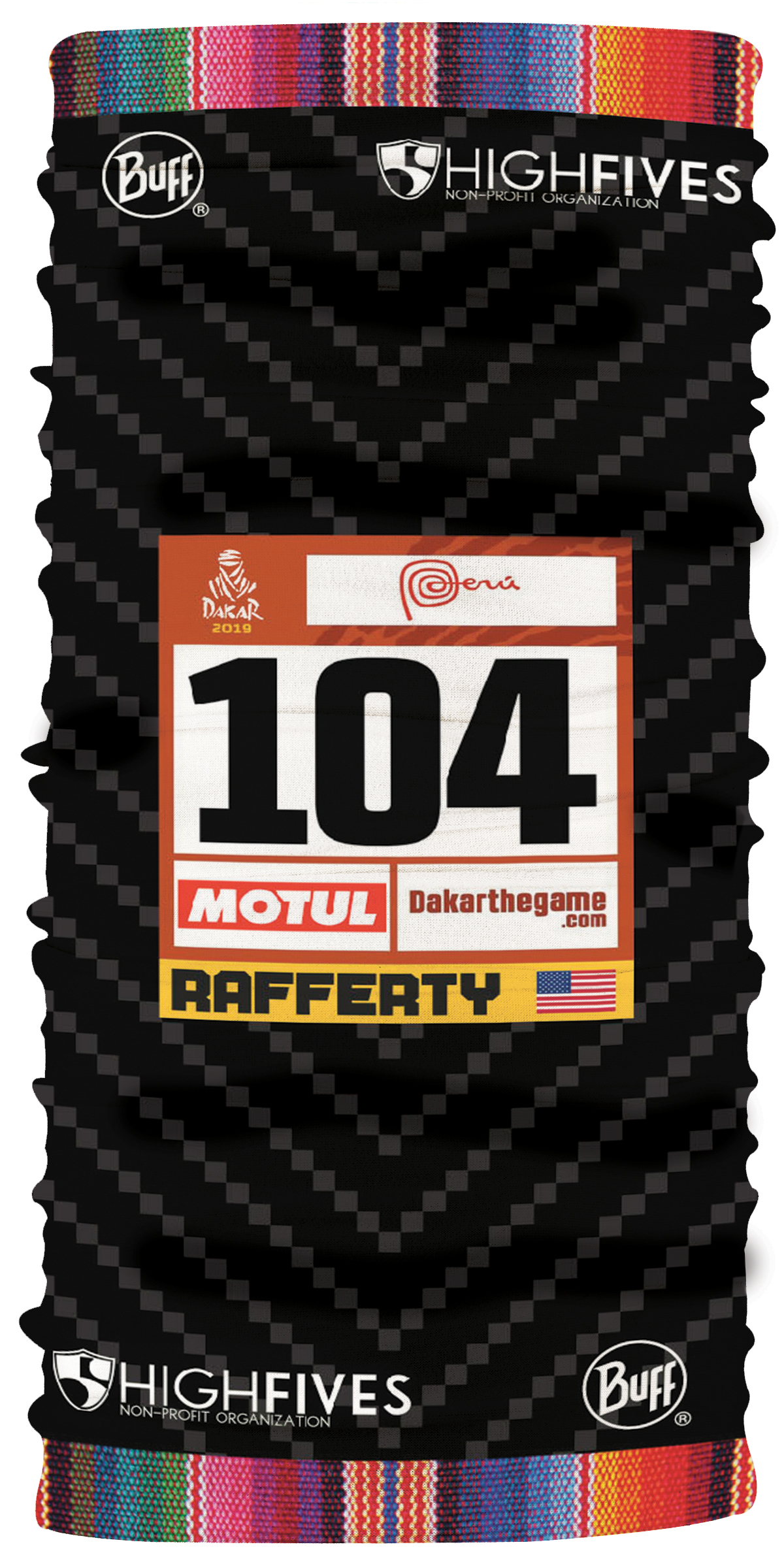 The first 50 donors committing at least $5/stage ($50 total) will get a custom, High Fives/Peruvian Dakar-themed Buff featuring Nathan's Dakar race plate.